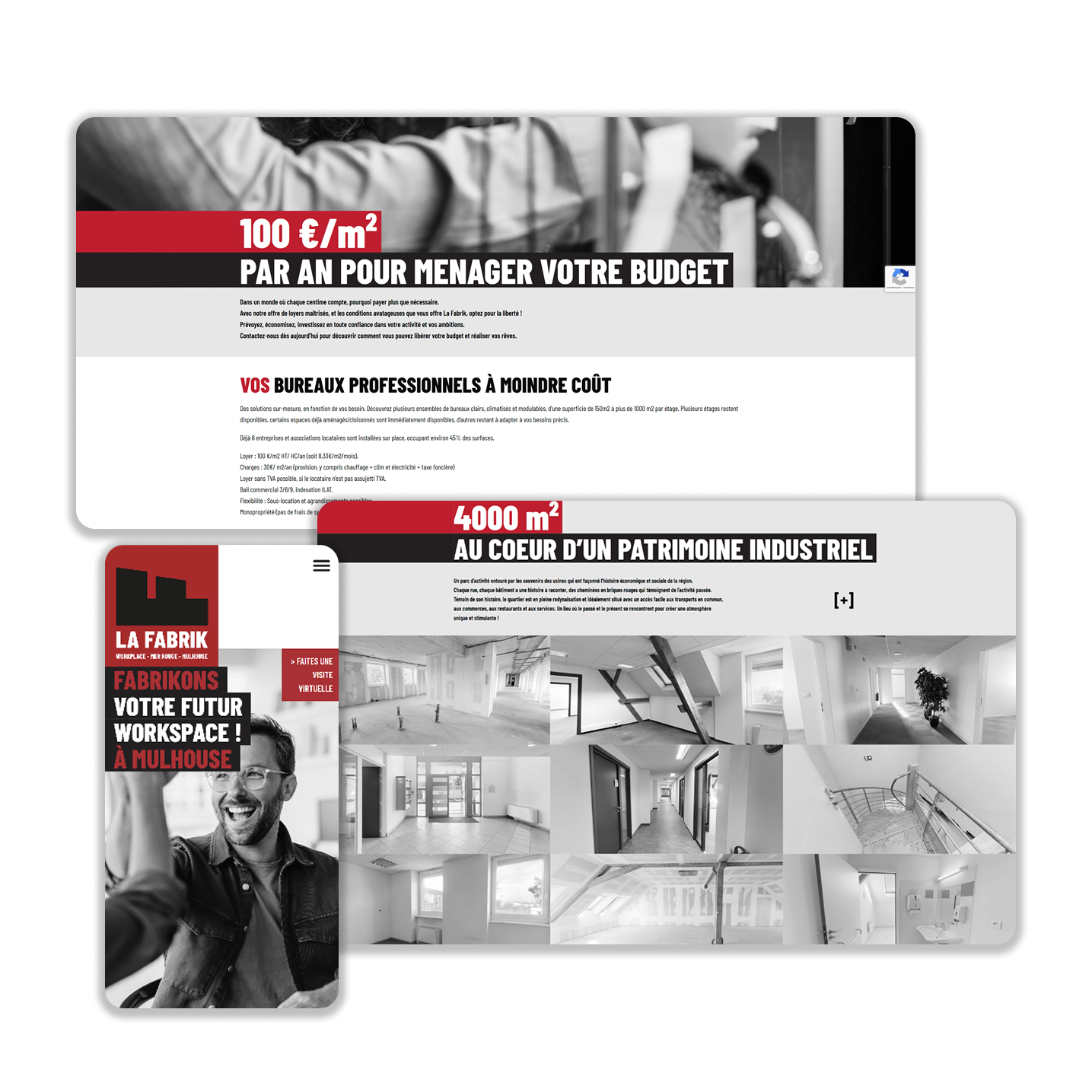 La Fabrik Mulhouse propose des espaces de bureaux modulables à louer au cœur d'un ancien bâtiment industriel rénové, situé dans le quartier Dornach à Mulhouse. Avec 4000 m² de surface disponible et des tarifs attractifs, le projet avait besoin d'un site web pour attirer entreprises et professionnels.